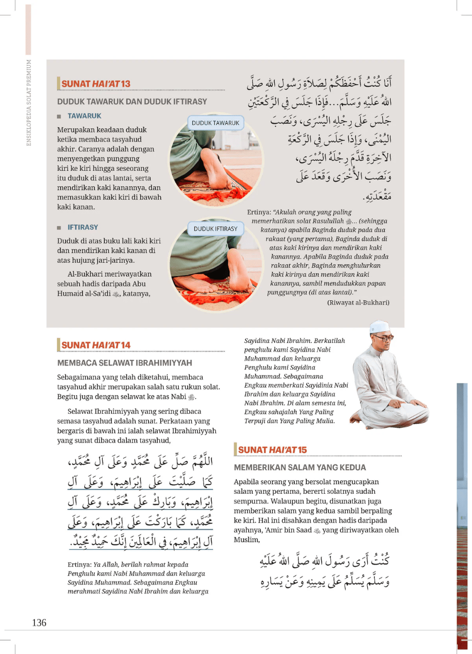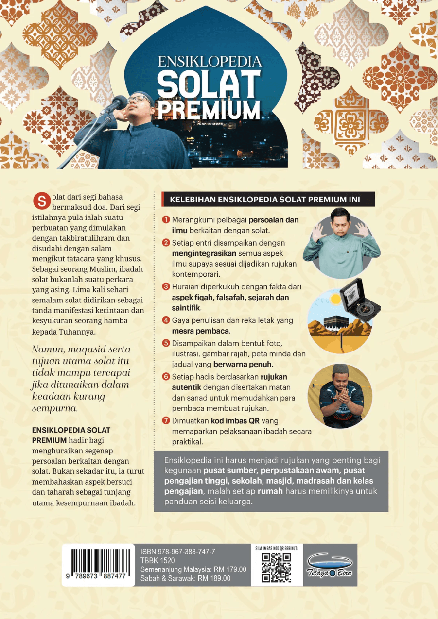 Buku ENSIKLOPEDIA SOLAT PREMIUM membawa penampilan sumber-sumber hukum fiqah yang lebih detail dan autentik daripada kitab turath, perbahasan ulama dalam hukum furuk serta kajian saintifik dan geografi yang akademik. Contoh-contoh amali digambarkan melalui proses fotografi dan ilustrasi yang tidak terdapat dalam buku-buku yang seangkatan dengannya.