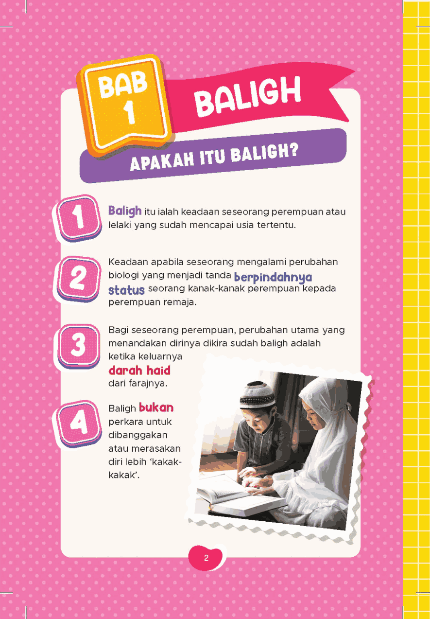 Mencakupi pelbagai pengisian seperti aspek latar belakang, ibadah, kebersihan, penjagaan diri dan sebagainya.